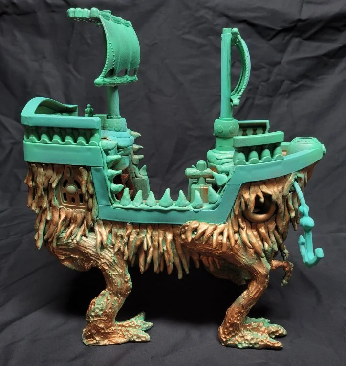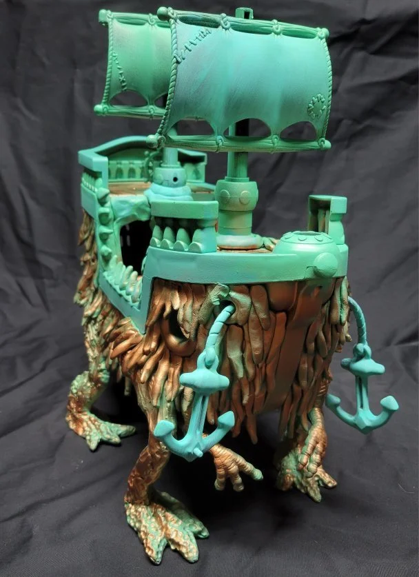 For Smashbash 2024’s Battle Royale I built a Mimic Ghost Ship bashed together from a kids pirate ship, model magic, and sculpey legs. This was my first foray into sculpting for a contest online. It was a great experience, I learned how to better play with wire armatures for the legs, learned model magic shrinks about 10 to 15 percent of its mass at least so I will have to reattach all the bits to the boat, and spray-paint is awesome.