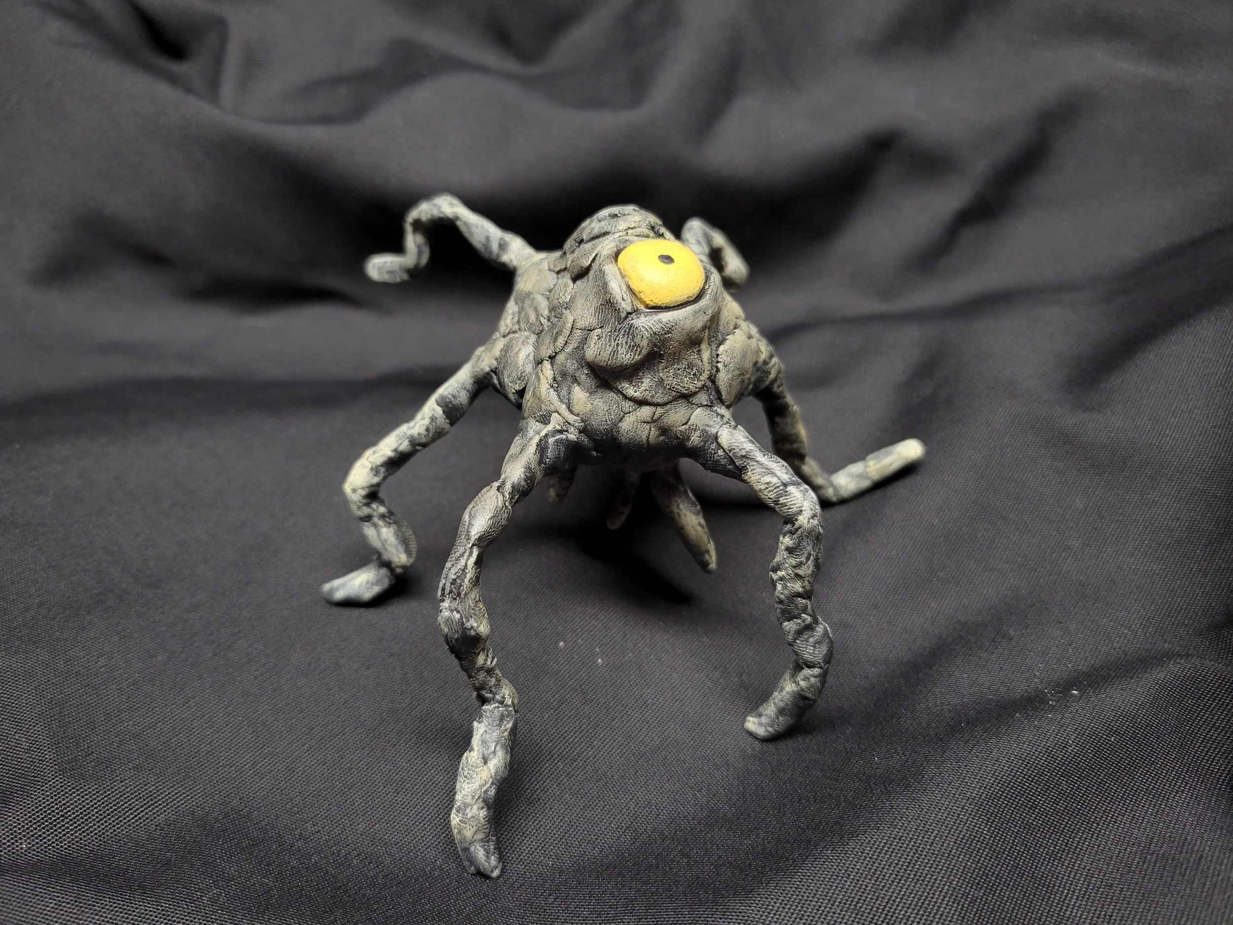 The beast. I knew I wanted to make one of my eye creatures differently and ended up with the idea of spoiled sentient food using a cupcake foil liner as a shell or house and ran with it. I used aluminum foil to form the body and lock in the armature wire in positions I liked. They still moved a bit so I added on the base layer of Sculpey and tossed it in the oven. I added more clay along the legs, thickening the connection points and covering all the wire. At this point I added an eye and textured the entire form. Satisfied I tossed him back in the oven. Once cool I did the standard prime coat, drybrush, wash, and painted the eye with several coats of paint. After everything was dry I went and put the cupcake liner on them and realized it looked off. I took this chance to go back to the video and realized that he needed to be based on a 60mm base, or 2.4 inches… his legs are around 6 inches around his central form, and upside down in the liner he lacks the same creep factor.