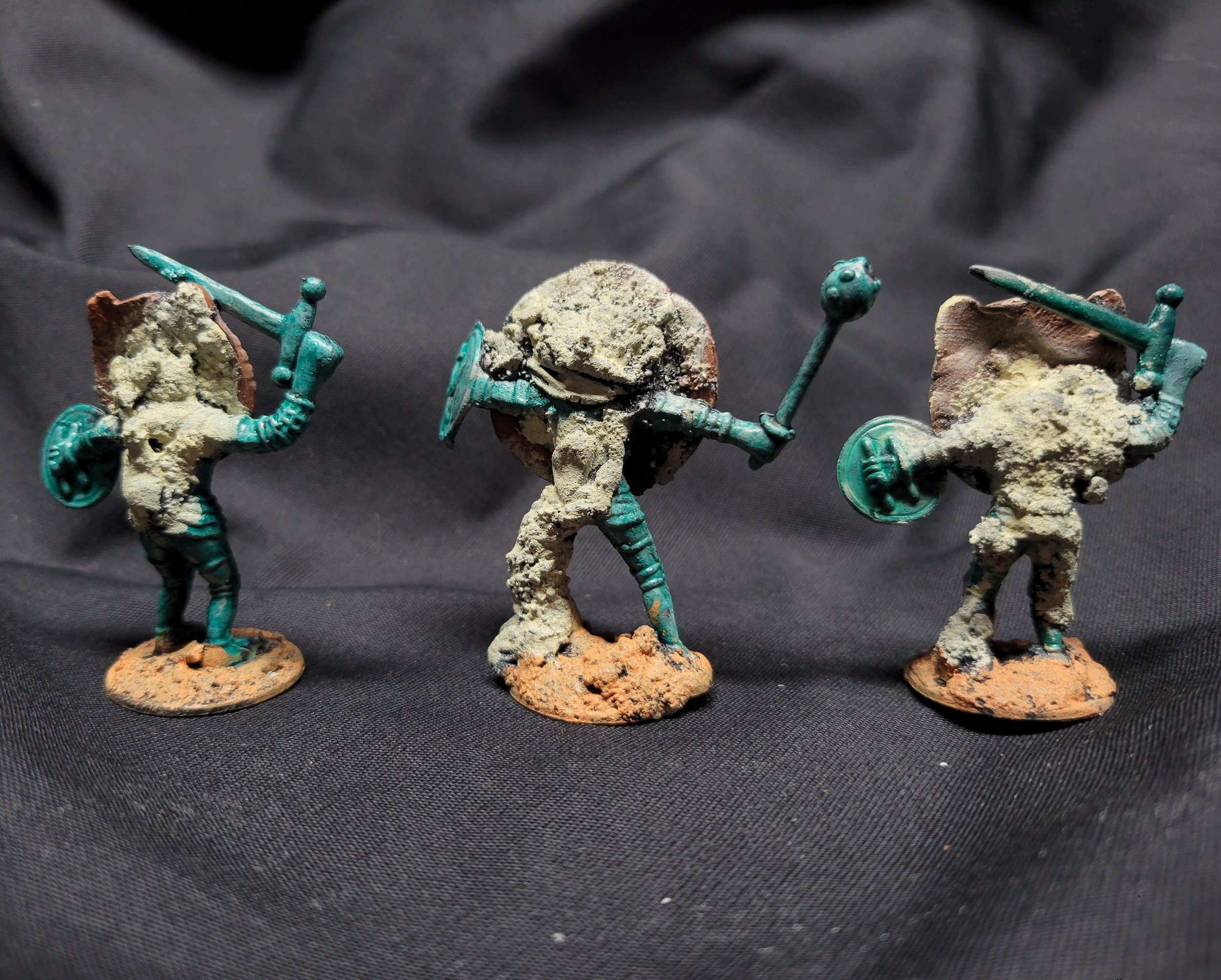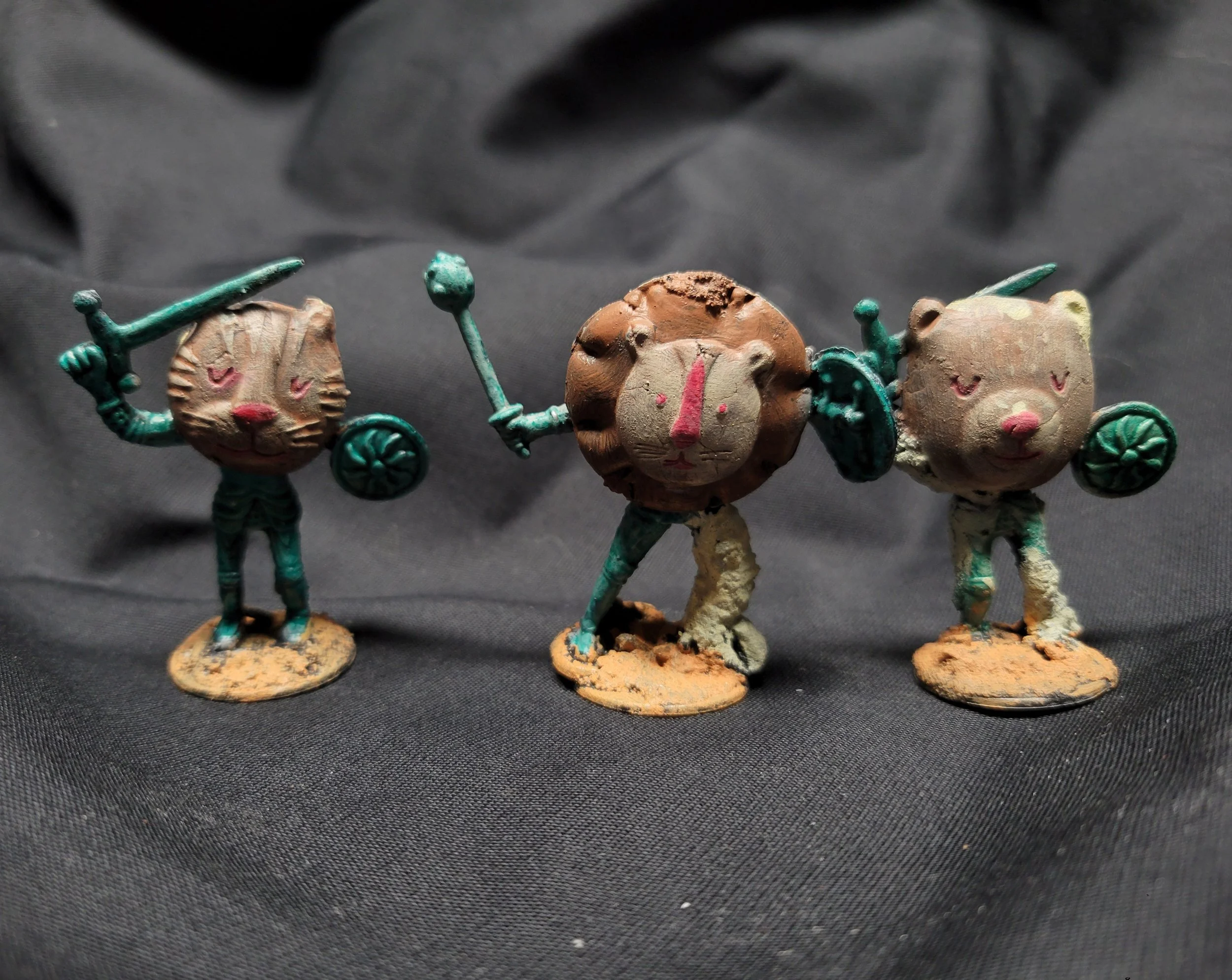 For the armies I took some plastic knights I picked up in a bucket at thrift store and sized them up with some fondant molds I bought a few years back with cute animal faces. I beheaded the knights and used the molds to make what would be comically oversized Sculpey masks for the knights, attaching more mid torso than on top. I used superglue with my basing mixture, covered some big gaps with Miliput, and had the idea to slather on some of my texture paints as well. The paint was the color of buttercream frosting, building onto the narrative that these knights were lost in the wastes for a long stretch of time and had to reassemble themselves with frosting to continue fighting.