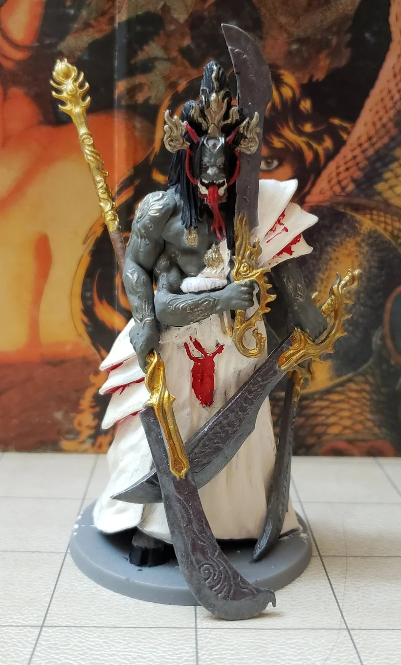 I knew when we started the story arc, I was going to need the best oni or ogre mage miniature I could find and luckily, I had found this one in a box set on sale at a local game store. I threw a quick paint job together and brought my other oni figures as lesser minions. It achieved the effect I wanted, the party knew he was a big deal when he towered over them. The Rising Sun board game has many fantastic oni miniatures and took some time to hunt down the base game. Incredible miniatures that are also scaled incidentally for rpg use.